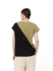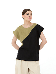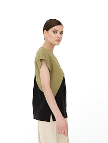 Свободный прямой крой с лаконичным силуэтом. Модель выполнена в минималистичном стиле с акцентом на асимметричное цветовое деление, что придает образу динамичность и современность. Короткие цельнокроеные рукава создают мягкую линию плеч.