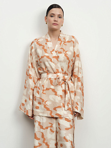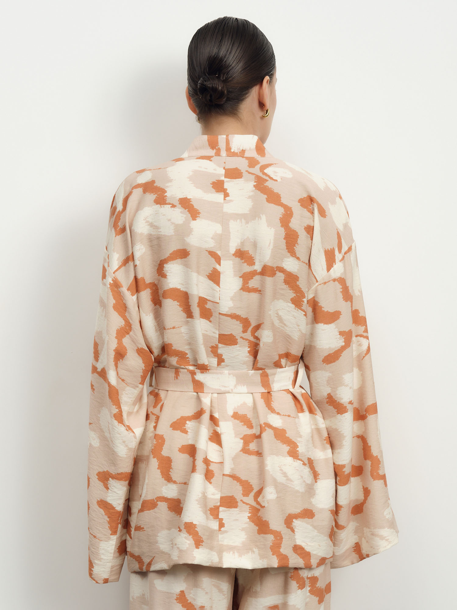 Свободный силуэт в стиле кимоно с запахом. Лаконичный крой дополняется динамичным рисунком, создающим эффектный образ.
