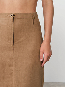 Пояс с аккуратной посадкой, шлёвки, задний разрез для свободы движения, чистые швы, натуральная текстура ткани.