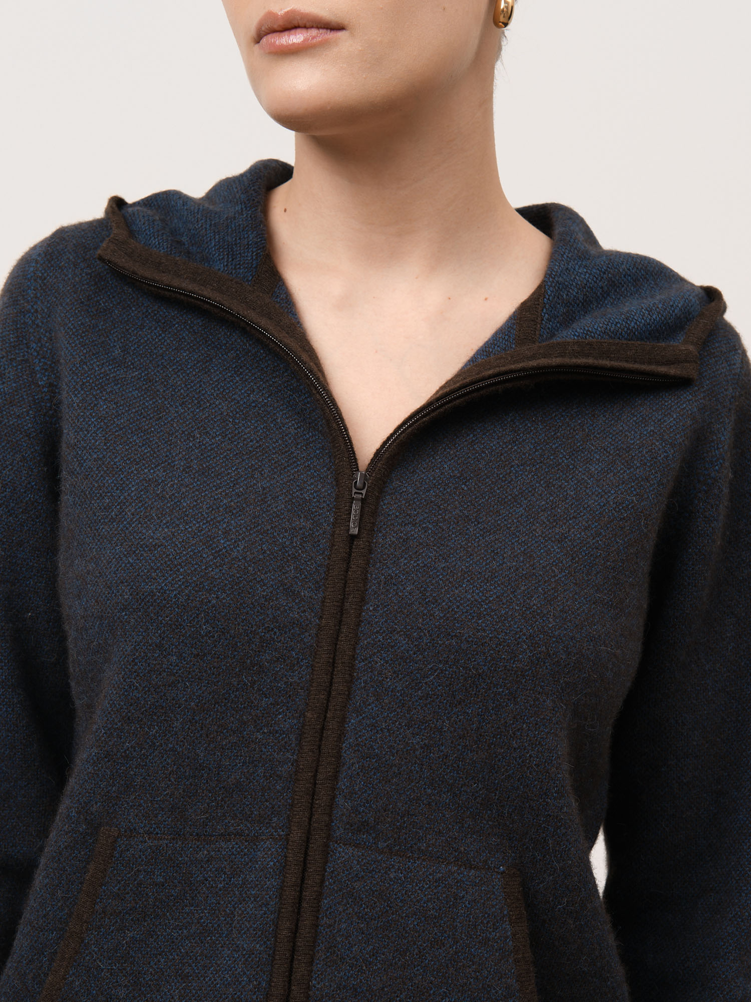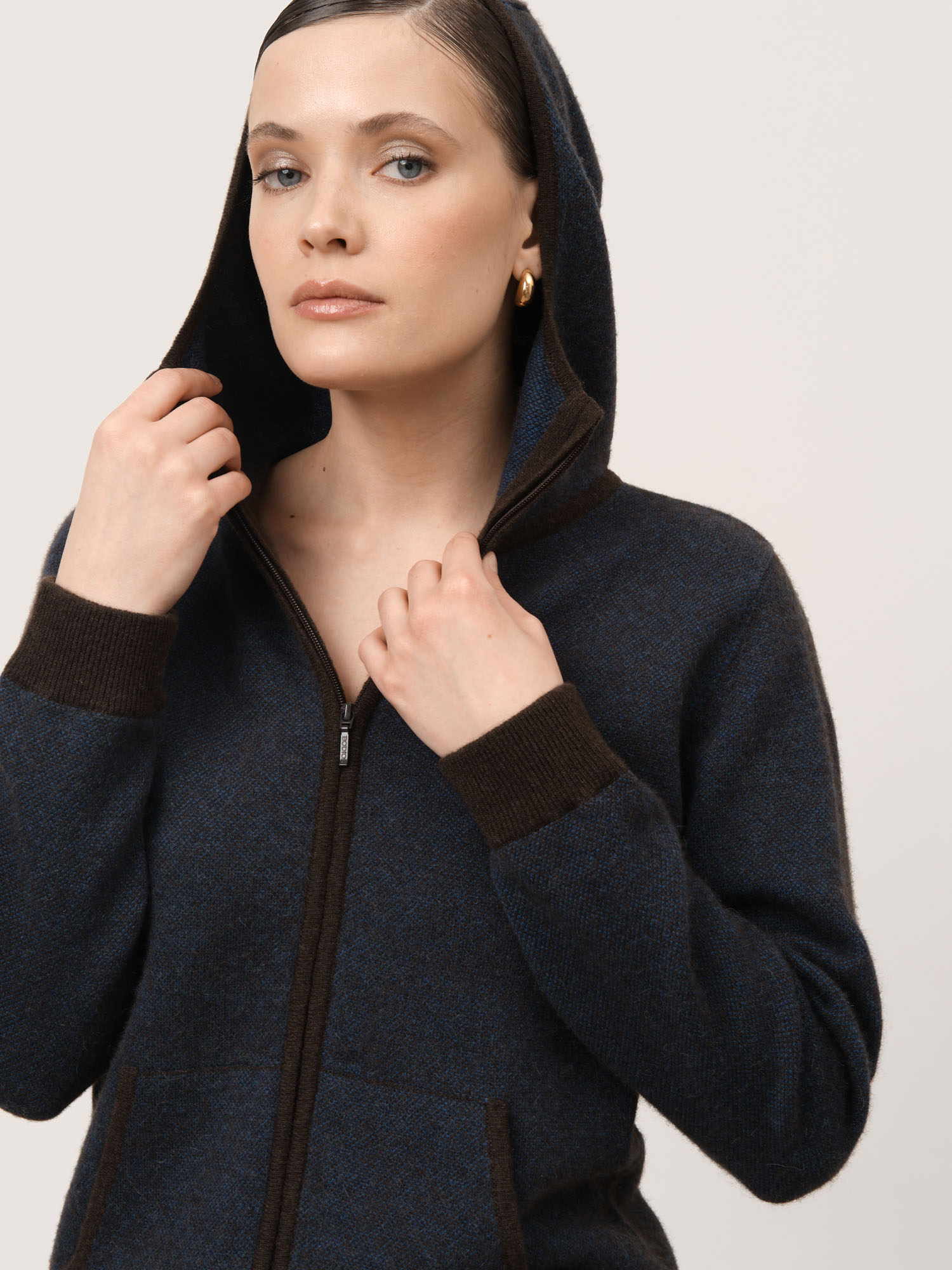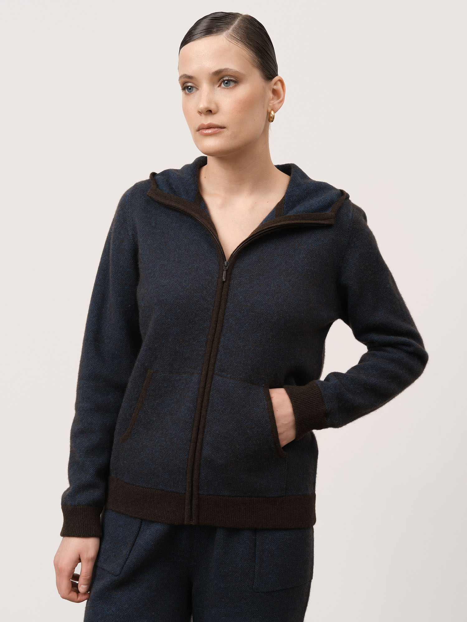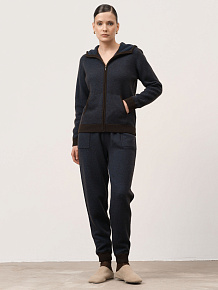 Капюшон, центральная застёжка на молнии, удобные боковые карманы и контрастная отделка манжет и нижнего края. Плотная вязка помогает изделию сохранять форму и аккуратный внешний вид.