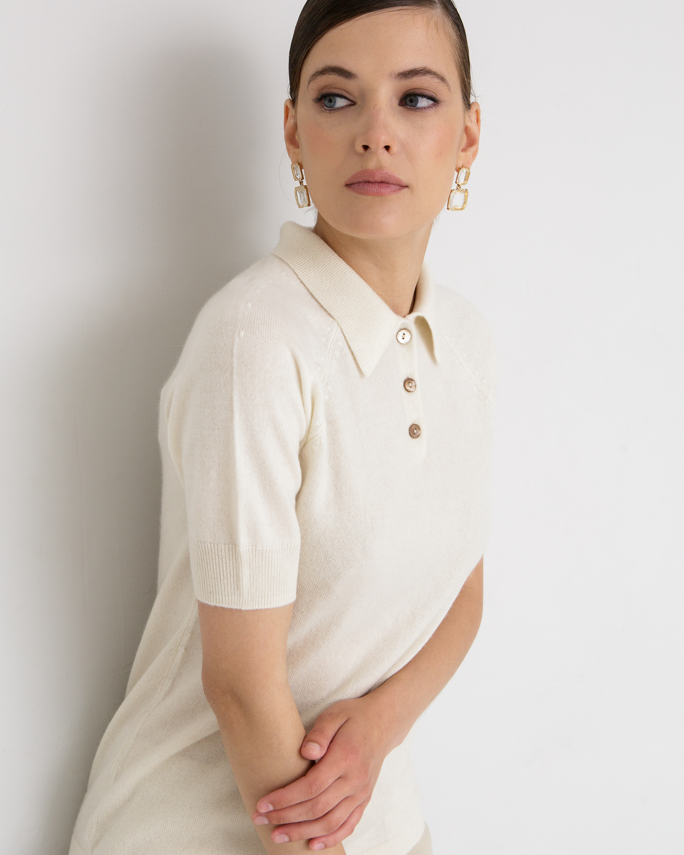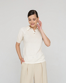 Модель выполнена в стиле поло с отложным воротником и короткими рукавами. Минималистичный крой подчёркивает аккуратность силуэта и делает джемпер универсальным для различных образов.