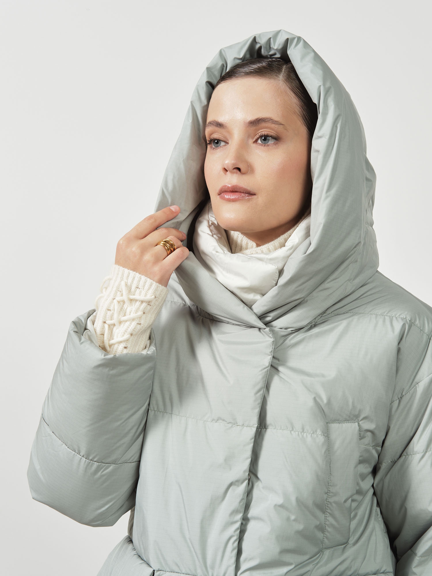 Глубокий капюшон с высоким воротником надёжно защищает шею и голову от ветра и холода, создавая дополнительный уют.