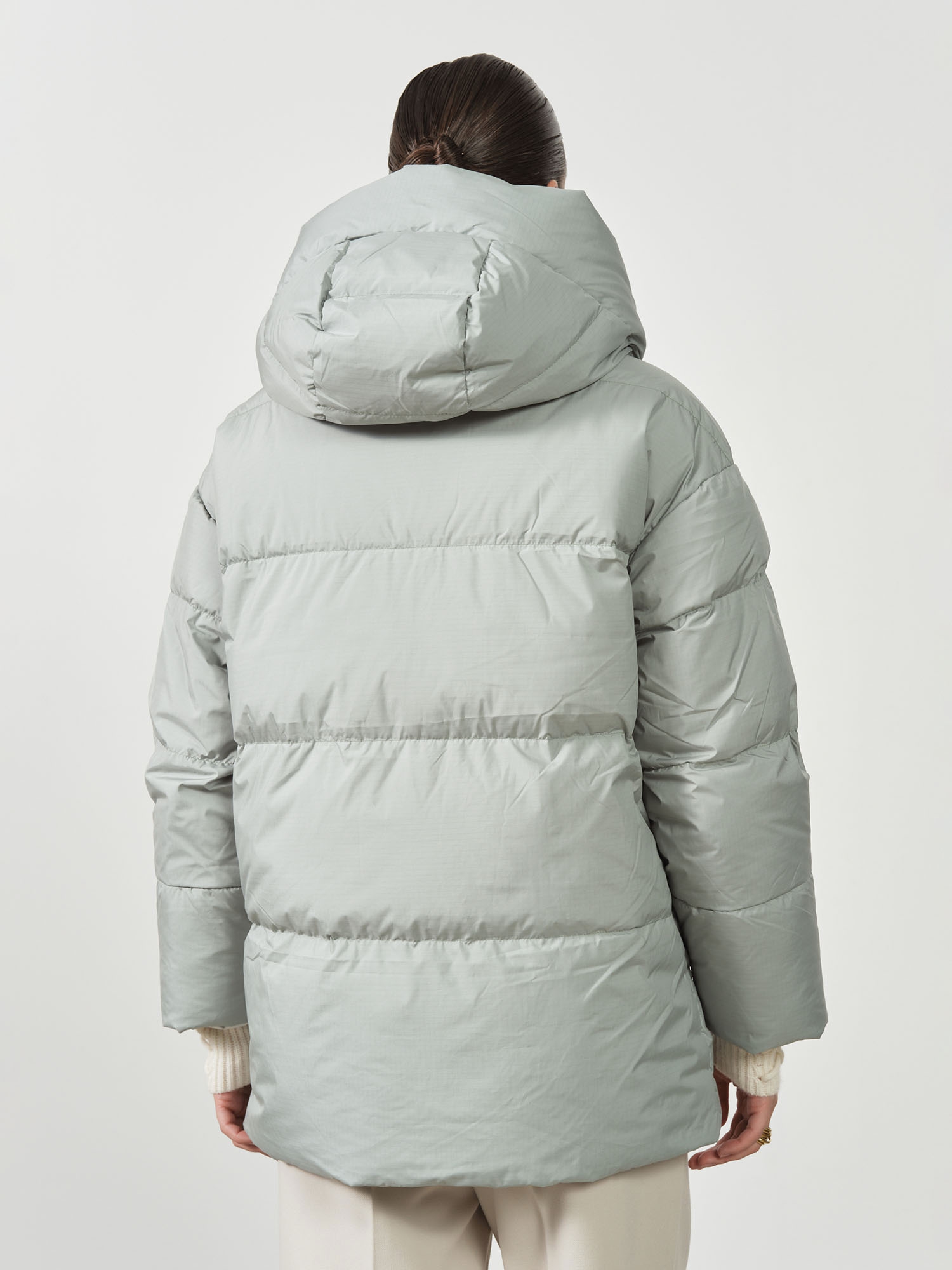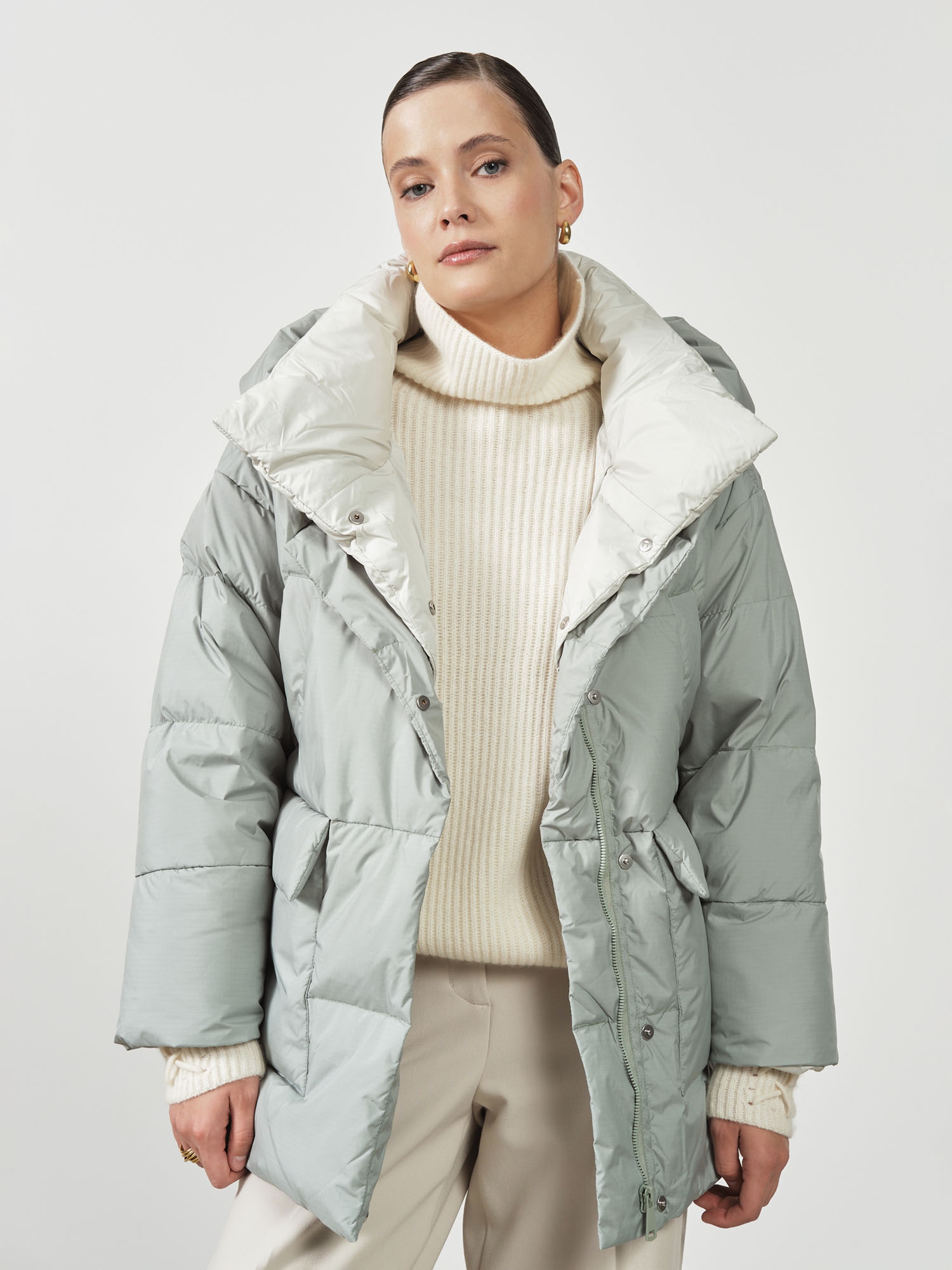 Свободный, слегка прямой крой не сковывает движений и позволяет легко сочетать куртку с объёмными свитерами и трикотажем.